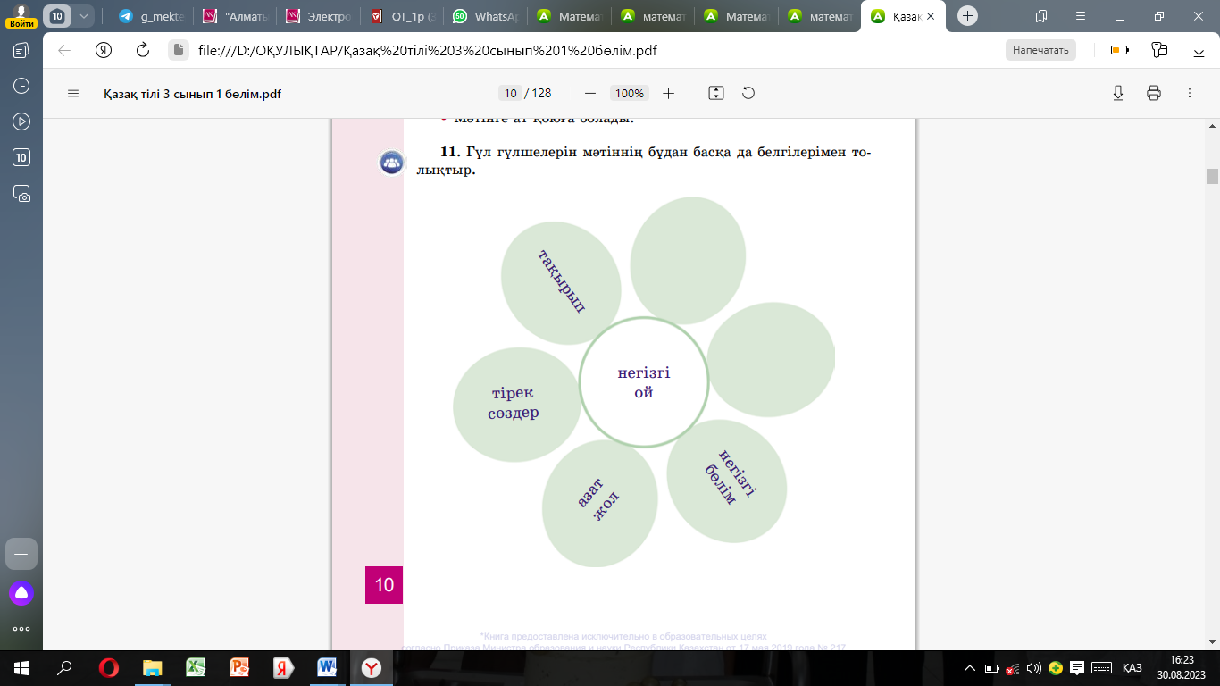1-тапсырма ФС Ұжымдық жұмыс «Дауыстап ойлану» әдісі Мәтінді тыңда. Мәтін кейіпкерлерін сипаттап жаз. Мәтіннен тірек сөздерді тап. Қарамен жазылған сөйлем туралы өз пікіріңді айт «Серпілген сауал» әдісі 1.Мәтін не туралы? ЕББҚ Тапсырма орындауда қолдау көрсету Талқылау сұрақтары: 1.Мәтін деген не? |