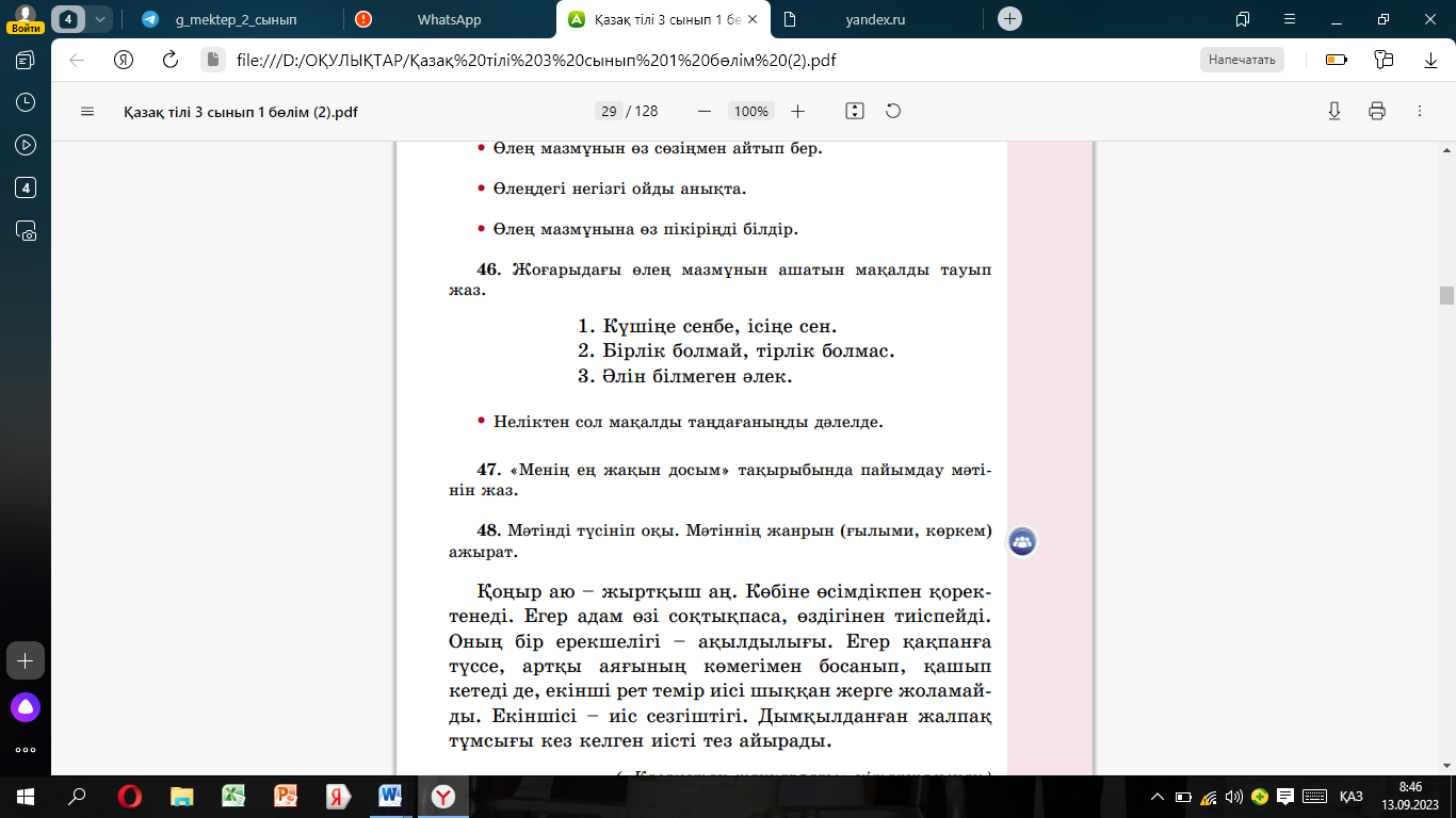 1. әріптердің бір-бірімен байланысын көркем жазу талаптарына сай жазады 2. бірінші мақалдың мағынасын ашады 3.екінші мақалдың мағынасын ашады Сұрақтарға жауап береді Әуенге сәйкес қол жаттығуларын жасайды |