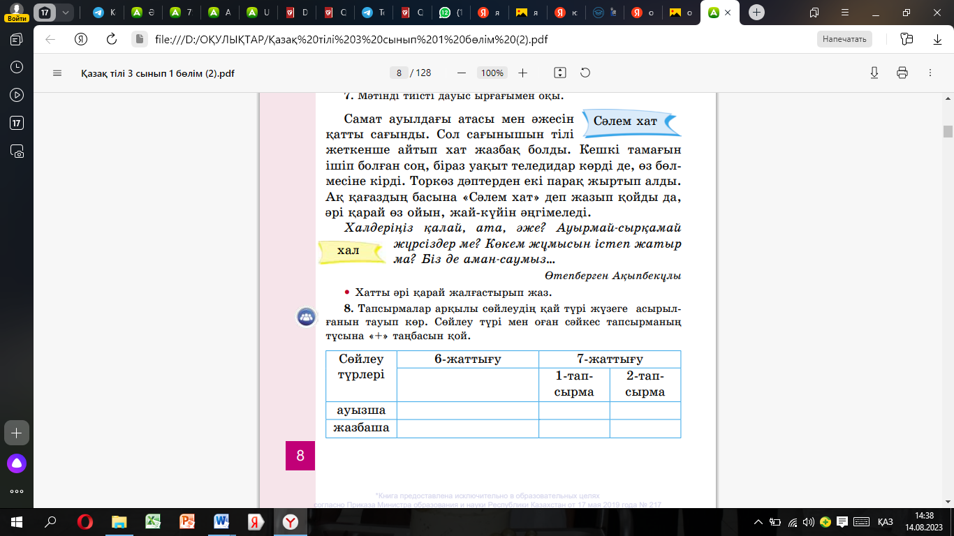 2- тапсырма Жеке жұмыс «Із кесуші» әдісі Мәтінді оқы. Хатты әрі қарай жалғастырып жаз. ЕББҚ Мәтін не туралы Талқылау сұрақтары: 1.Сөйлеу неден тұрады? «Тралалалалала» әуеніне қол жаттығуына арналған қимылдар жаса |