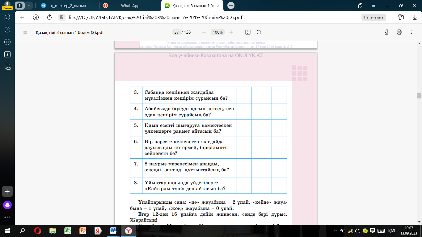 Өз әдептілік деңгейіңді тест тапсырмасын орындау арқылы бағалайды
