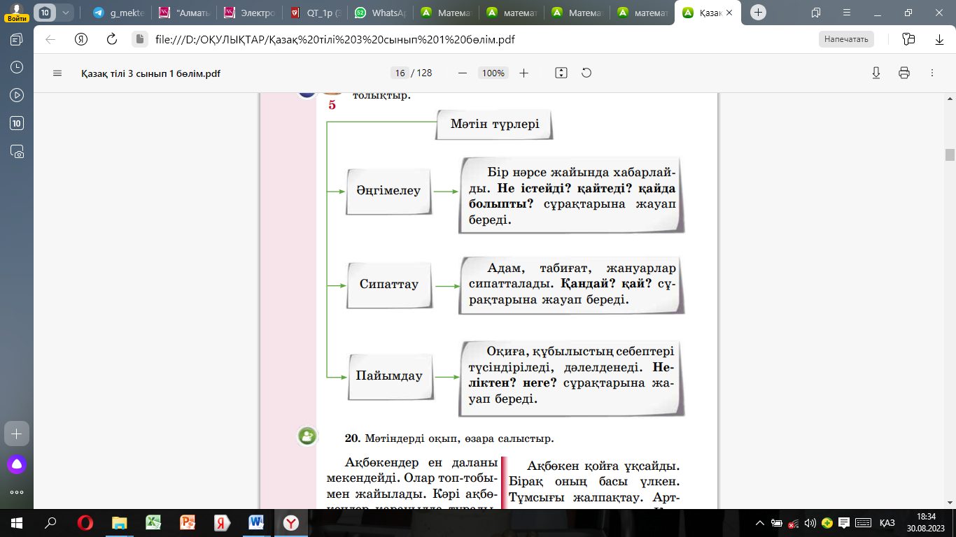 1. мәтін мазмұнын әңгімелейді 2.мәтін кейіпкерлерін сипаттап жазады 3.мәтіннен тірек сөздерді табады 4.өз пікірін айтады