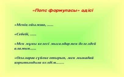 Сабақты қорытындылау мақсатында оқушылардың сабаққа деген көзқарасын, рефлексия жасайды «ПОПС формуласы» Дескриптор арқылы өзін-өзі бағалайды. |