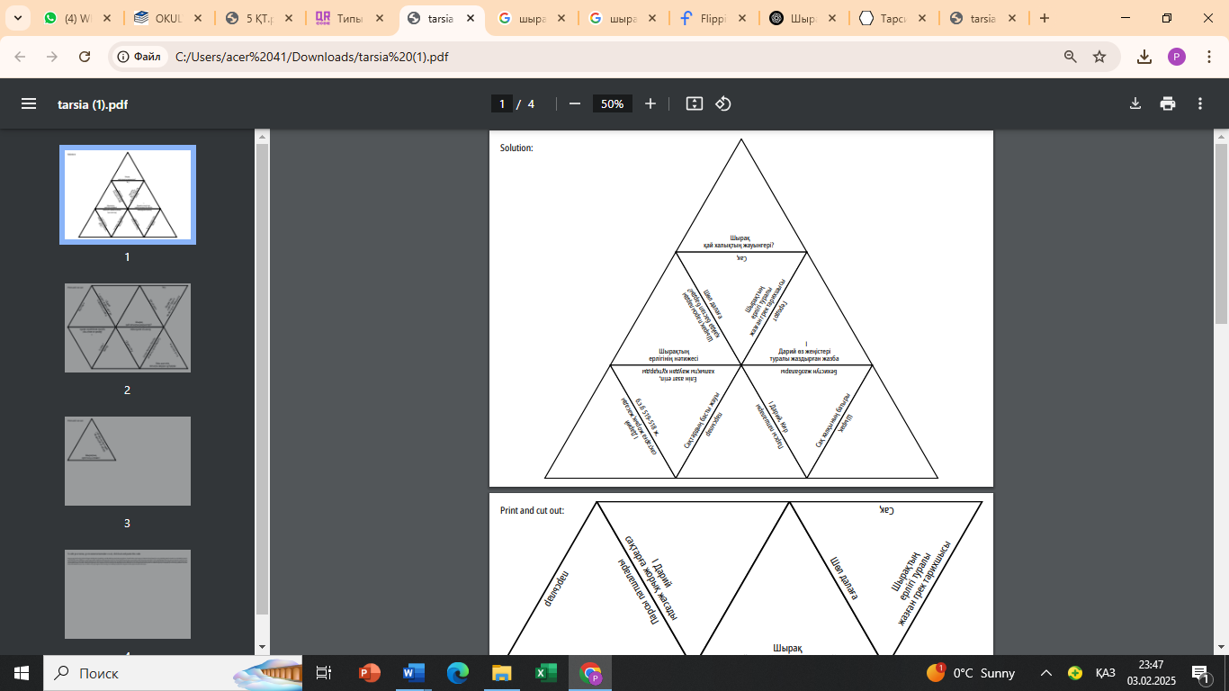 1-тапсырма.«Шырақтың ерлігі» тақырыбында видеоролик қосу. Шырақтың ерлігі туралы видеоны көргеннен кейін оқушылардың түсінігін кеңейту және ойландыру үшін келесі сұрақтар қойылады: 1.Видеодағы басты кейіпкер кім, кімдер арасында соғыс болған? 2.Шырақ қандай қиындықтарға тап болды? 3.Парсы әскері неге Шыраққа сеніп, оның артынан ерді? 4.Егер Шырақ парсыларды адастырмаған болса, қандай салдарлар болуы мүмкін еді? 2-тапсырма. Жеке жұмыс.Парсылардың сақтарға жорығы туралы мәтін таратып,«Кім? Қайда? Қашан?» әдісі арқылы оқушылар келесідей сұрақтарға жауап береді. 1.Кім батырлық көрсетті? Кімнің деректерінде Шырақтың ерлігі туралы жазылған? 2.Қайда болған оқиға? 3.Қашан, қай жылы болды? 3-тапсырма Топтық жұмыс. Tarsia Maker әдісі арқылы оқушы сәйкес жауапты тауып, берілген үшбұрышты фигураны шығаруы керек.