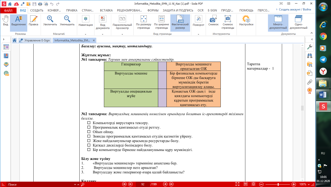 Білу және түсіну 1. «Виртуалды мәшинелер» терминіне анықтама бер. 2. Виртуалды мәшинелер неге арналған? 3. Виртуалдау және гипервизор өзара қалай байланысты? Деңгейлік тапсырмалар: А деңгейі. Сызбаны толықтыр. Сызба оқулықта берілген. В деңгейі. Интернеттің іздеу жүйелерін қолданып, виртуалды мәшинелер жасауға арналған, сұранысқа ие программалардың рейтингін жаса. С деңгейі. «Виртуалды мәшинелердің арналымы» тақырыбында таныстырылым дайында. |