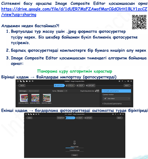 Жаңа тақырыпты меңгеру Видео жазбаны қарау Image composite Editor бағдарламасының интерфейсін көрсету Мұғалім бағдарламадағы жұмыстың негізгі кезеңдеріне назар аударады, камераның әртүрлі қозғалыс режимдерін көрсетеді және режимге байланысты соңғы панорама қалай өзгеруі мүмкін, CROP кезеңіне, панораманың жетіспейтін бөліктерін аяқтау мүмкіндігіне назар аударады. Білімді бекіту. 1-тапсырма. Алдымен неден бастаймыз 1.Виртуалды тур жасау үшін .jpeg форматта фотосуретке түсіру керек. Біз шеңбер бойымен бүкіл бөлменің фотосуретке түсіреміз. 2.Барлық фотосуреттерді компьютерге бір бумаға көшіріп алу керек. 3. Image CompsiteEdiror қосымшасын төмендегі алгоритм бойынша орнат: Панорама құру алгоритмін қарастыр Бірінші қадам – Файлдарды импорттау (фотосуреттерді)
