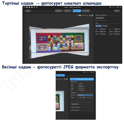 қиылып алынады. Бесінші қадам – фотосуретті JPEG форматта экспорттау.