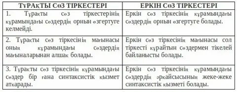 Тұрақты сөз тіркесі, фразеологиялық тіркес – екі немесе одан да көп сөздердің тіркесуінен жасалып, бір ұғымды білдіретін бейнелі сөздер тобы. Тұрақты сөз тіркесінің құрамындағы сөздер өздерінің дербес мағыналарынан ажырап, жеке-дара сөздерге балама ретінде жұмсалады, олардың тіркестегі мағынасы жеке тұрғандағы мағынасына сай келе бермейді (көре алмау – қызғану; іші күю – өкіну, т.б.) тұрақты сөз тіркесі бірнеше топқа жіктеледі: идиомалық тіркестер немесе идиома (қабырғаңмен кеңес, ешкімнің ала жібін аттама); мақал-мәтел (Ел үмітін ер ақтар, ер атағын ел сақтар; Өнерлінің өзегі талмас). Тұрақты сөз тіркесі қатарына бұлардан басқа екі кейде одан да көп сөздердің қатар жұмсалуынан жасалып, бастапқы мағынасын сақтай отырып, бір ұғымды білдіретін тіркестер (лексикалық тіркестер) де кіреді. Мысалы, қол қою, көз салу, қол ұшын беру, т.б. |