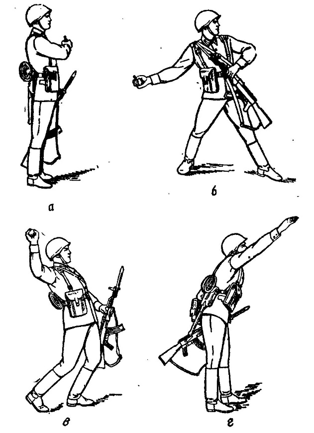 Түсіну - нысанаға қарап тұру; - гранатаны оң қолға (егер солақай болса, сол қолға), ал қаруды сол (оң) қолға ұстау; - сақтандырғыш мұрындықты суырып алу; - оң аяқты бір қадам артқа тартып, оны аздап тізеде бүгіп және денені оңға бұра (бұрала) отырып, қолды артқа және төмен қарай соза доға бойы құлаш жаю. - оң аяқты тез түзеп және кеудемен нысанаға қарай бұрылып, гранатаны иықтан жоғары және қол ұшын қосымша сілтей лақтыру керек. Лақтыру сәтінде дененің ауырлығын сол аяққа түсіріп, қаруды жылдам артқа жіберу керек. |