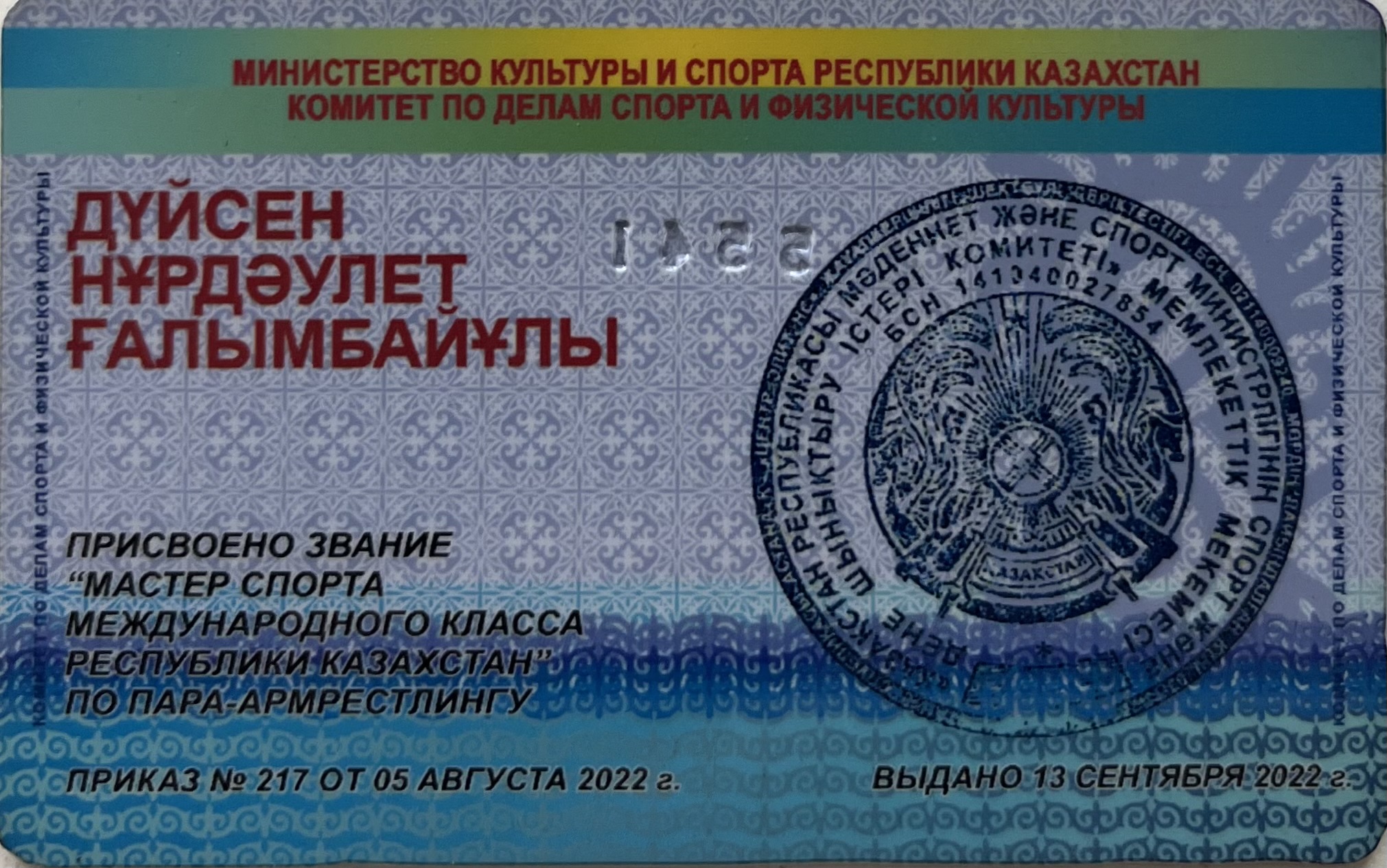 2019 жылдың 25-28 наурыз күндері аралығында Алматы облысы Талдықорған қаласында өткен Қазақстан Республикасының чемпионатында І-орын,