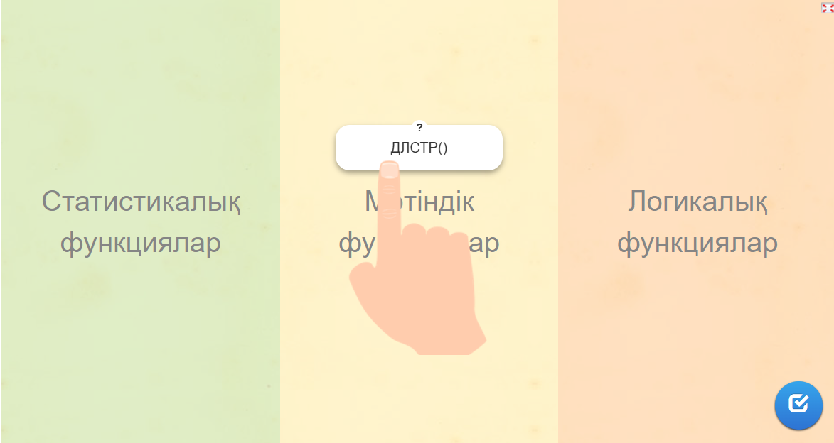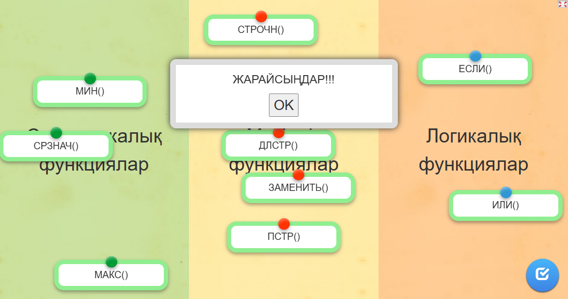 Бекіту тапсырмасы: Сабағымызды «Тест сұрақтары» әдісі арқылы бекітеміз. Ол үшін барлығыңыз тапсырма парқшасында берілген QR код арқылы өтулерініз керек. СУММ() функциясы қандай қызмет атқарады? a) Санның түбірін табады b) Санның қосындысын шығарады c) Бөлінудің қалдығын есептейді КОРЕНЬ() функциясының нәтижесі қандай? a) Бүтін сан b) Квадрат түбір c) Қосынды Егер ОСТАТ(10;3) функциясын қолдансаңыз, нәтиже қандай болады? a) 3 b) 1 c) 0 Кері байланыс: Балалар, бүгінгі сабақ туралы ойларыңызды айтсаңыздар. Сабақ сіздерге ұнады ма? Бүгін қандай жаңа нәрсе үйрендіңіздер? Қандай қиындықтар болды? «Жұлдыз» әдісі