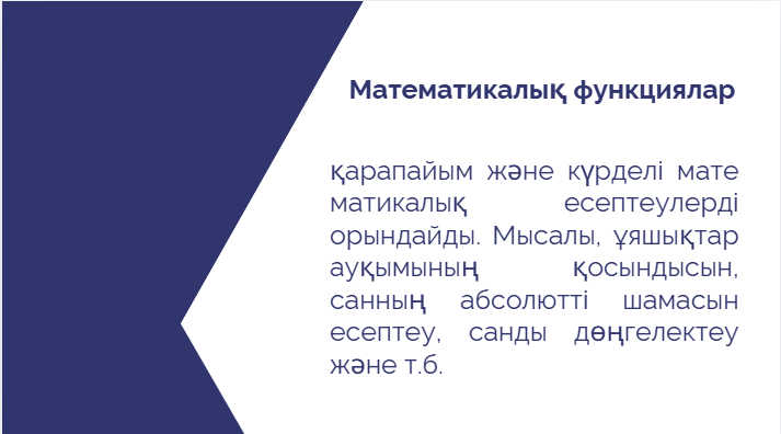 Барлығыңыз оқулықтың 86-шы бетін ашып, тақырыпты дәптерге жазып алыңыздар. Excel бағдарламасында деректерді өңдеу кезінде математикалық функцияларды қолдану өте маңызды. Бүгін біз мына функцияларды қарастырамыз: СУММ() – сандарды қосады. КОРЕНЬ() – санның квадрат түбірін табады. СТЕПЕНЬ() – санды дәрежелеу үшін пайдаланылады. ЦЕЛОЕ() – санның бүтін бөлігін алады. ЧАСТНОЕ() – бөлінудің нәтижесін көрсетеді. ОСТАТ() – бөлінудің қалдығын анықтайды. Сабақтың мазмұнымен танысу үшін барлығымыз тақтаға назар аударайық. Презентация: