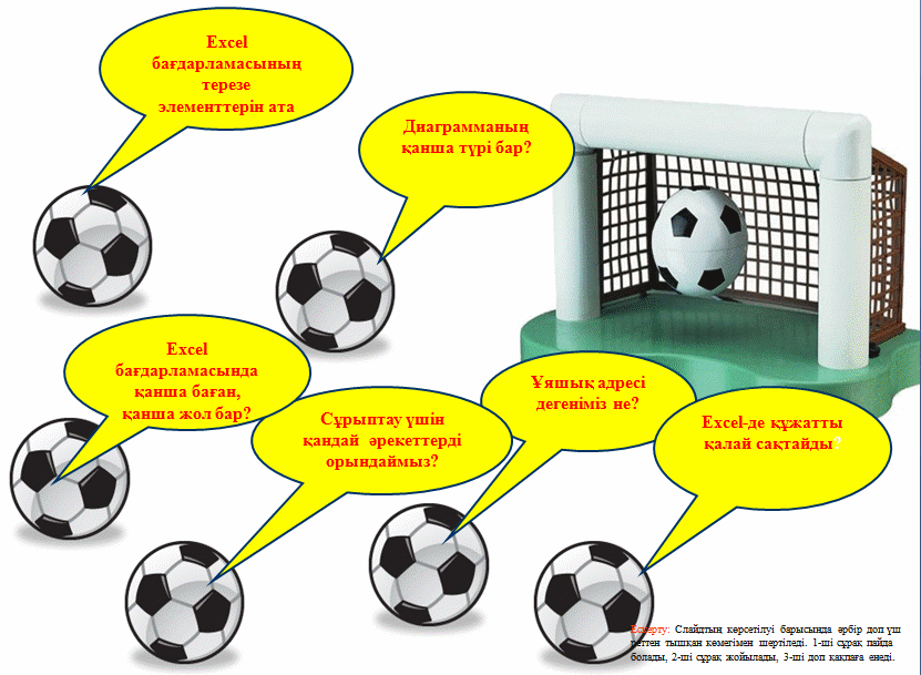 1.Ұйымдастыру бөлімі (Қ) Қалыптастырушы бағалау үшін жұмыс. Әр оқушы жеке жұмыс парағында жұмыстанады. Microsoft Excel программасы қалай іске қосылады? - Формула қандай символмен басталады? - Автоқосынды деген не? - Диаграмма деген не? - Диаграмманың қандай түрлері бар? - Диаграмма қандай элементтерден тұрады? |