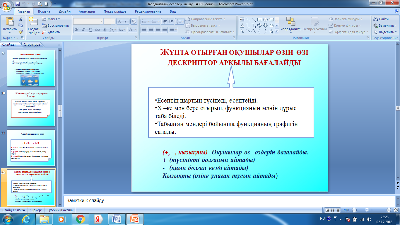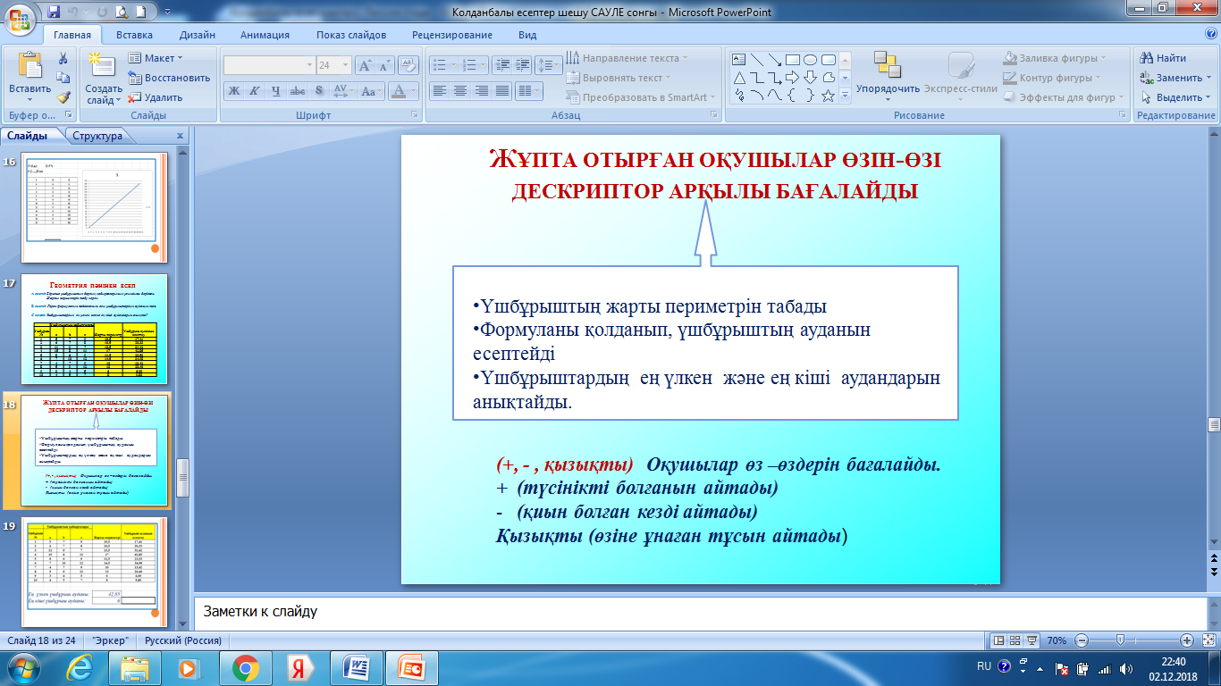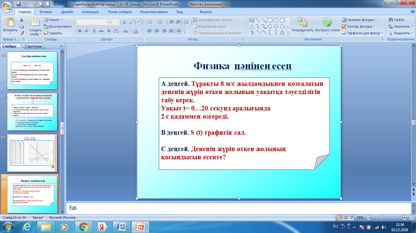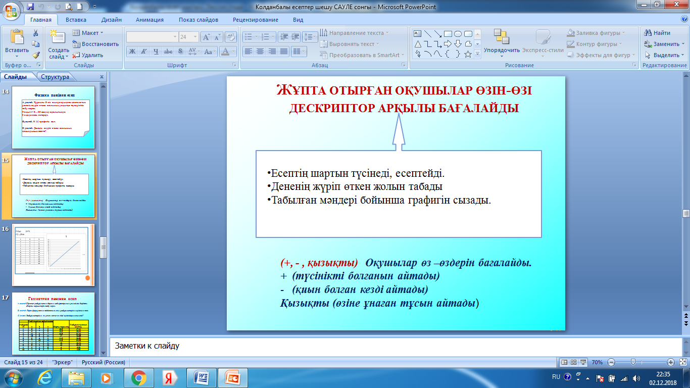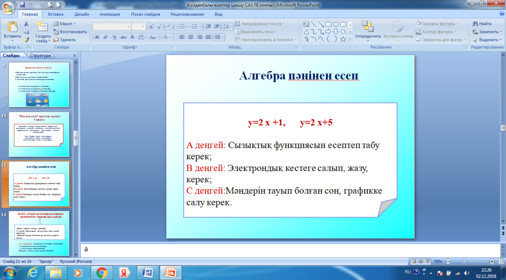 3-плюс алған оқушыға күн белгісін; 2 -плюс алған оқушыға бұлт белгісін; 1 -плюс алған оқушыға ай белгісін беріледі. 3-тапсырма «Кім жылдам» Жұптық жұмыс. Деңгейлік тапсырма. Қолданбалы есептерді шешуде физика, алгебра және геометрияның есептерін электрондық кесте Microsoft Excel программасында функцияларды қолданып есептер шығару. (5 минут уақыт беріледі). 1-топ: Алгебра пәнінен “Сызықты функцияны есептеп шығарып, графигін сызады”.