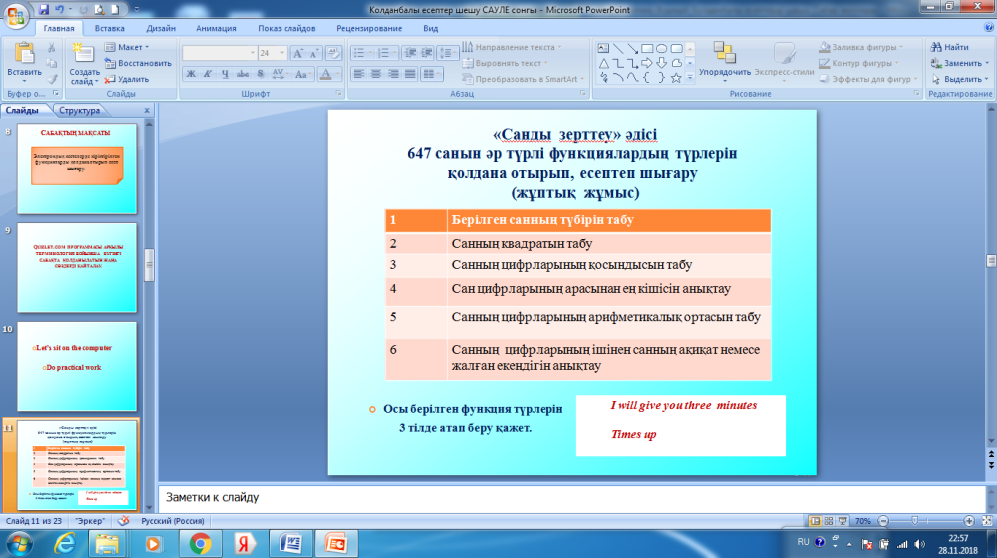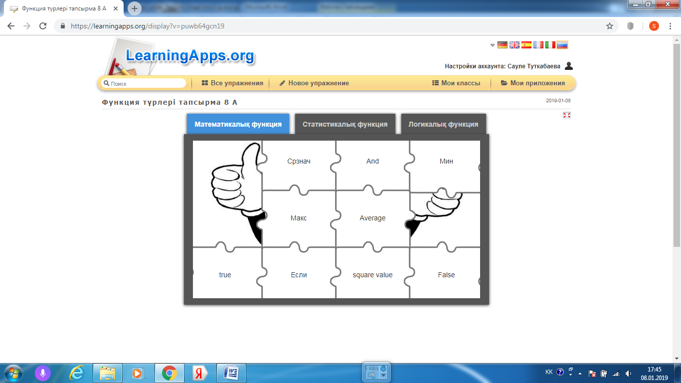 Ынтымақтастық атмосфераны қалыптастыру: Үш тілде амандасу арқылы оқушыларға жақсы көңіл күй сыйлау. Бүгінгі сабағымыз тәттінің дәмі сияқты ерекше болсын деген мақсатпен, бүгінгі сабақ құнды да қызықты болсын деп сендерді 3 түрлі тәтті түрлерімен топқа бөлгім келіп отыр. Оқушылар 3 топқа бөлінеді: 1 –топ «Формула» 2- топ «Функция» 3-топ «Электрондық кесте» 1-тапсырма. Жеке жұмыс. Ширату жаттығуы: «Learning apps» программасы арқылы «Орнын тап» ойыны бойынша оқушылар функция түрлерін топтастырып, оның мағынасын түсіндіріп шығады.