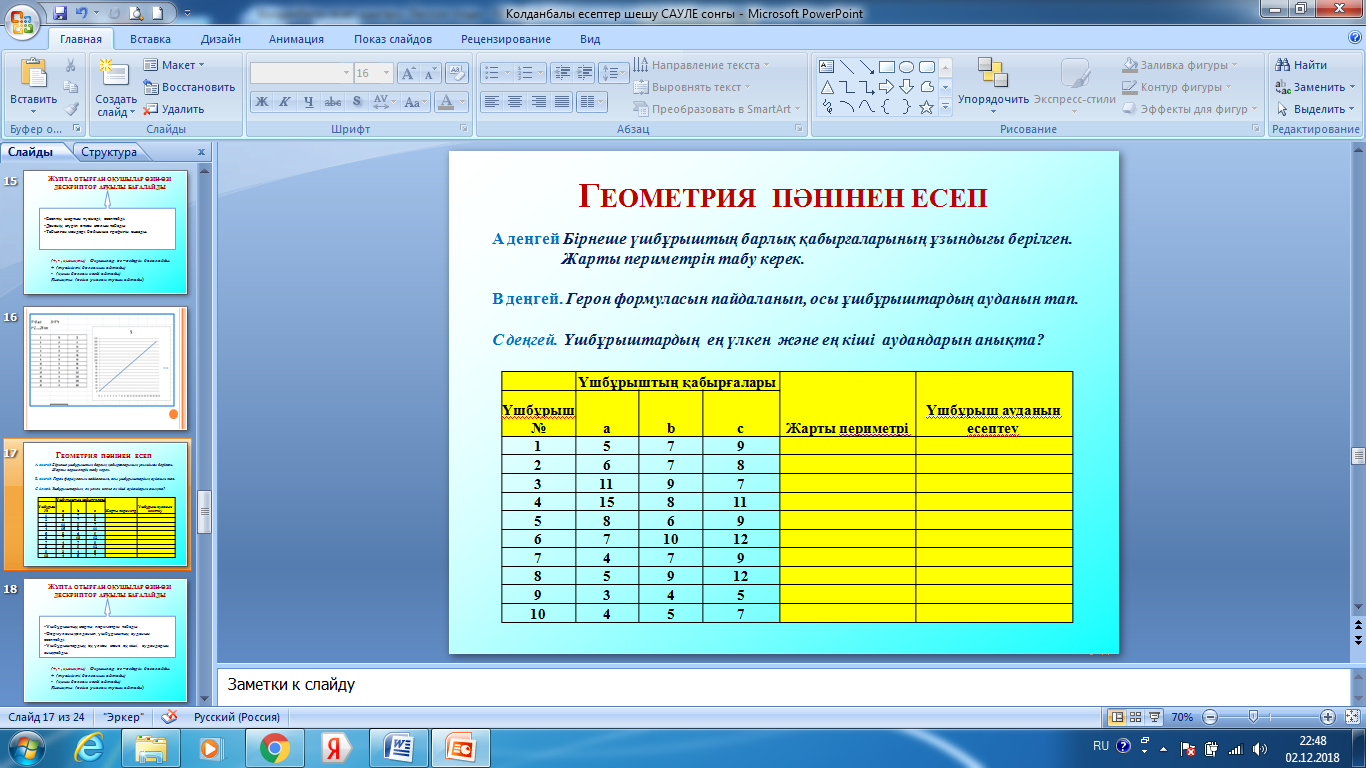 3-топ: Геометрия пәнінен «Үшбұрыштың жарты периметрін есептеп, ауданын табады».