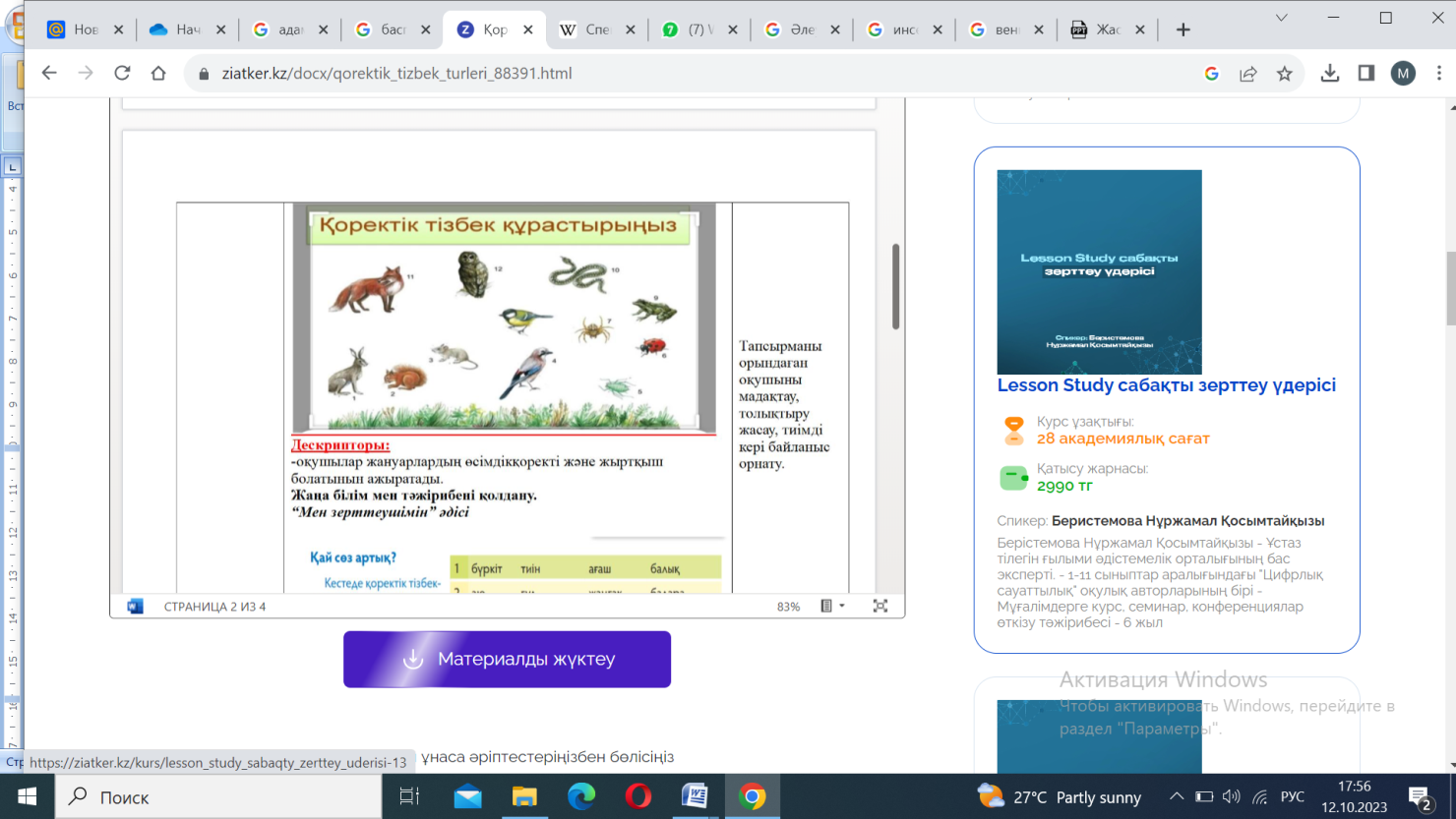 Дескриптор: Э.Венн диаграммасын қолданып екі тізбекті қоректену түріне қарай ажыратады ( 2 балл) Дескриптор: Қоректік тізбектің моделін құрастырады, суретін салады ( 2 балл) Дескриптор: Қоректік тордың бұзылуына не себеп болуы мүмкін екенін анықтайды ( 2 балл) Дескриптор: Қоректік тізбектегі артық сөзде таба алады Неліктен артық екенін түсіндіре алады ( 2 балл) Дескриптор: Қоректік тізбек құрастырады( 2 балл) |