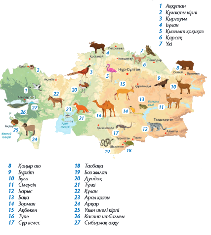Қасқыр, қоян, аю, ақбөкен, сазан, алабұға, жайын, үкі,қарға, қырғауыл бүркіт, тасбақа,жылан бақа