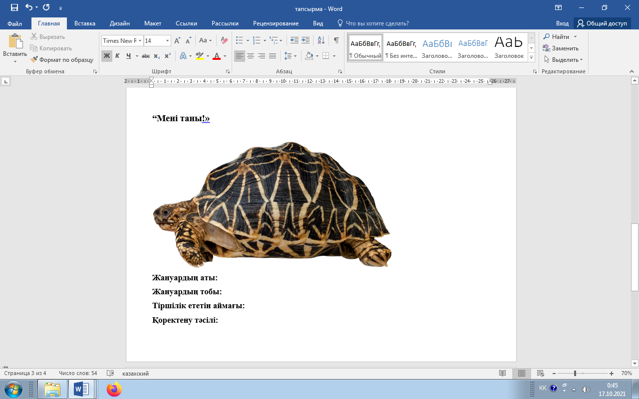 Өз өлкеңде қандай жануарлар тіршілік етеді? Жауап: Жамбыл облысында тасбақа, жылан,қарсақ, түлкі, кесіртке және т.б. тіршілік етеді Дескрипторы: Өз өлкесіндегі жануарлар туралы біледі Олардың тіршілігі туралы айта алады.