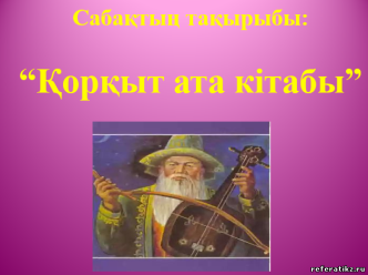 Мағынаны тану. 1-тапсырма. «Қорқыт ата кітабының » шығармасы қай жанрға жатады? Қорқыт ата – VIII ғасырда Сырдария өзенінің бойында бұрынғы Жанкент қаласы маңында өмір сүрген данагөй көріпкел, асқан күйші, бақсы, жыршы, ел басқарған көрнекті қайраткер. Қобыз аспабын алғаш ойлап тапқан, ұрпақтарға «Желмая», «Ұшардың ұлуы», «Әуппай», «Аққу», «Елім - ай!», «тарғыл тана» т. б. күйлерді қалдырған ұлы өнерпаз қобызшы, күй атасы. 6-тапсырма. «Тотем» сөзінің мағынасын талдаңдар.