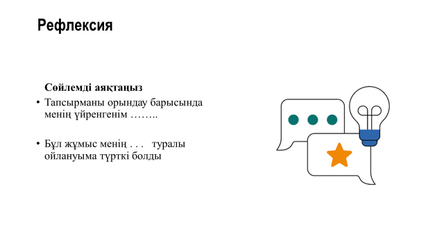 Рефлексия «Сөйлемді аяқтау» әдісі арқылы сабақтың оқу нәтижесіне қол жеткізгендігі туралы ойларын жазып сөйлемді аяқтайды.