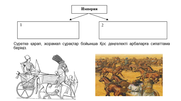 1-тапсырма . Оқулықпен жұмыс: 1-топ. Төмендегі кесте бойынша империя ұғымына сипаттама беріңіз.Суретке қарап, жорамал сұрақтар бойынша Қос дөңгелекті арбаларға сипаттама беріңдер?