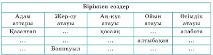 4.1.4.1 - тірексөздер мен жоспарды пайдалана отырып монолог құрау; 4.4.2.1* - күрделі сөздердің түрлерін ажырата алу (біріккен сөз, қос сөз, қысқарған сөз) |