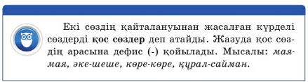 Биік-биік, ыдыс-аяқ, кіп-кішкене, көйлек-көншек, анда-санда, қарқ-қарқ, жап –жасыл. Қос сөздердің құрамындағы сөздерге назар аудар. Өзің таңдаған қос сөздерді қатыстырып, бірнеше сөйлем құра. Мен анама ыдыс-аяқ жууға көмектестім. Сырттан біреулердің қарқ-қарқ күлген дауыстары шықты. Айдостың әдемі кіп-кішкене күшігі бар екен. Балалар қардан аққала жасап ойнап жүр. Үсті-бастары қар-қар. Биік-биік таулар алыстан көз тартады. Айгүлдің шашы желмен желп-желп етті. Жанат бұған қуана-қауна келісті. -Қос сөз сөйлемге қандай мағына үстегенін байқа. -Қос сөзді құрап тұрған сыңарларды салыстыр. |