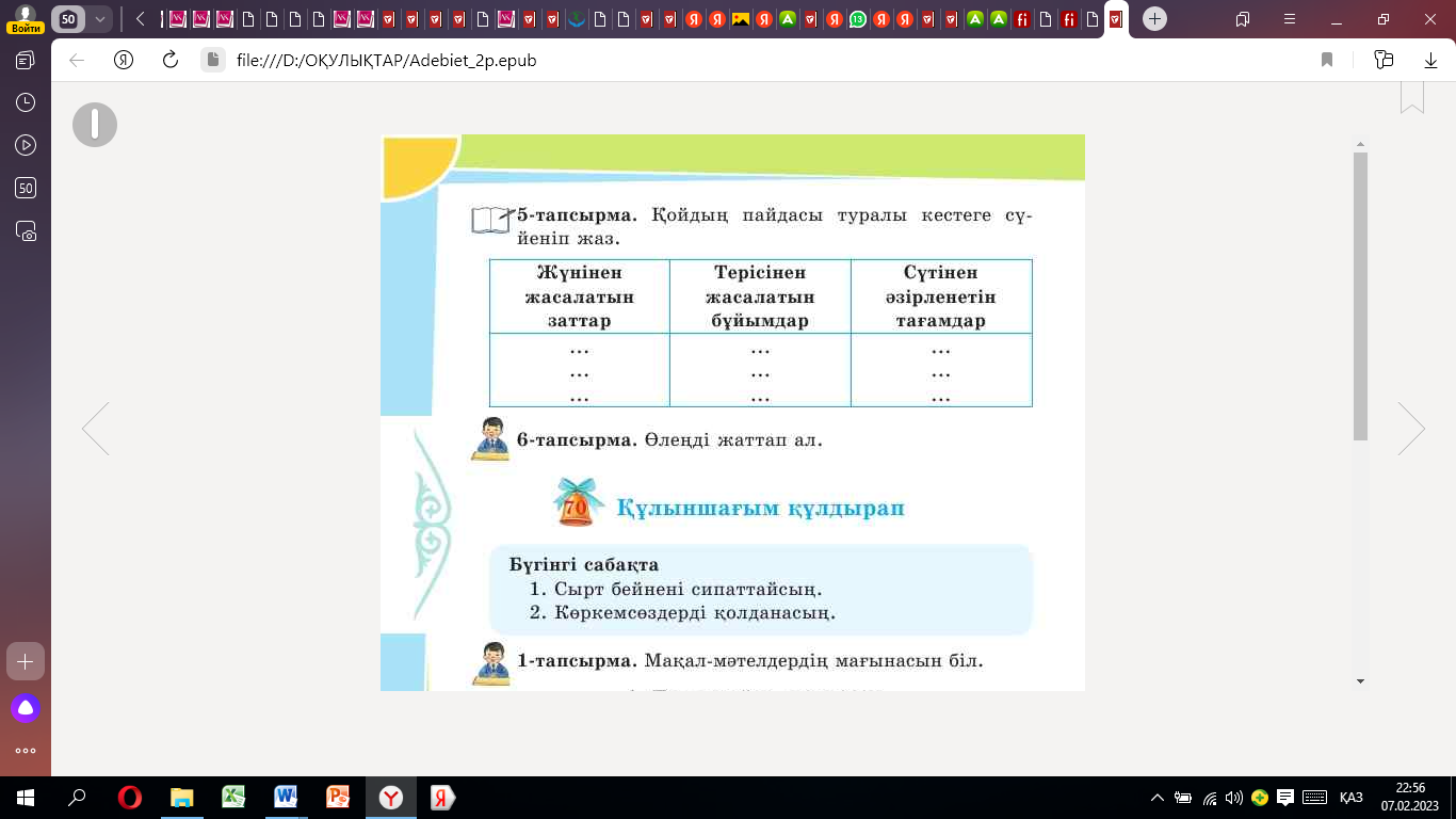 «Комментарий» арқылы Дескриптор: -қойдың жүнінен жасалатын заттарды жазады(1б) - қойдың терісінен жасалатын бұйымдарды жазады(1б) - қойдың сүтінен әзірленетін тағамдарды жазады(1б) -қорытынды жасайды(1б) |