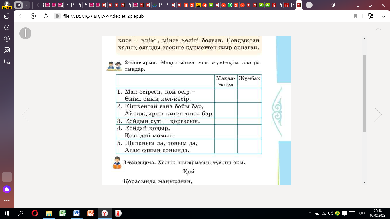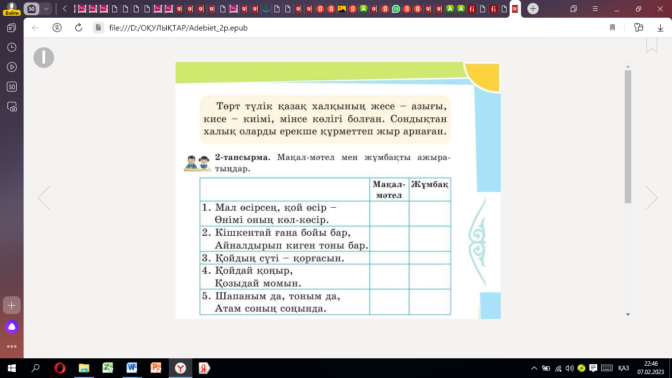 2.2.4.1 – мақал-мәтел, жұмбақ, ертегі, тұрмыс-салт жырлары, әңгіме, өлеңнің жанрлық ерекшеліктерін анықтау. |