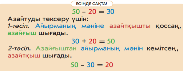 2 тапсырма: Кестемен жұмыс Қосынды мен айырма құрастырыңдар. Олардың мәнін табыңдар. Қалай тексеруге болатынын түсіндіріңдер. 30+20=50 100-80=20 10+50=60 70-10=60 40+20=60 80-10=70 ЕББҚ оқушыға: 20 мен 30-дың қосындысына 10-ды қос.