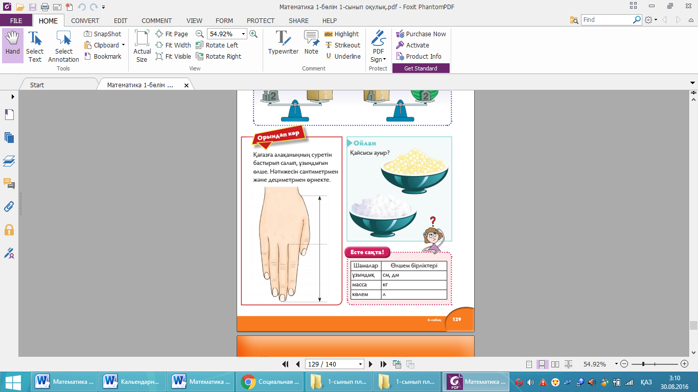 Кіріспе тапсырма. Бір ыдысты алып, осы ыдыстың көлемін, массасын, ұзындығын өлшеуге болатынын айтыңыз. Мүмкін болса, бір ыдысқа әртүрлі өлшеу жұмыстарын жүргізіңіз. Сыйымдылығы 2-3 литр бо-латын әртүрлі бірнеше ыдысты қолданып, жұмысты топпен орындатыңыз (ыдыстар өлшеуге ыңғайлы болу керек): — бірінші, ыдыстың биіктігінің қанша сантиметр болатынын анықтатыңыз; — eкінші, ыдыстың сыйымдылығын бір литрлік құтының көмегімен су құйып анықтатыңыз; — үшінші, ыдысты таразыға салып, массасын анықтатыңыз. Жұмысты орындап болған соң әртүрлі сұрақтар қою арқылы қорытындылаңыз: Ұзындықты қандай өлшем бірлікпен анықтадың? (см) Ыдысқа 2 литр су сыяды. Қандай шама жайында айтылып тұр? (көлем) Массаның өзің білетін өлшем бірлігін ата. (кг) Ыдысқа қанша су сыятынын анықтау арқылы заттың несін білеміз? (көлемін) Ыдысты таразыға салып өлшеу арқылы нені анықтаймыз? (массасын) Табаныңның ұзындығын өлше. Тапсырманы орындау үшін оқулықтағы суретті басшылыққа ала отырып, оқушылардың барлықтарына табандары-ның ұзындықтарын өлшеуді ұсыныңыз. Олардың әрқайсысына табандарын бастырып сызуға бір парақ қағаздан таратып беріңіз. Одан кейін үлкен бақайынан өкшесіне дейінгі ұзындықты анықтатыңыз. Нұсқаулық ретінде оқулықтағы суретті ұсыныңыз. Табан ұзындығы бойынша аяқкиімнің өлшемін анықтауға болатынын түсіндіріңіз. Оқулықта берілген кесте бойынша оларға аяқкиімінің өлшемін анықтауды ұсыныңыз. |