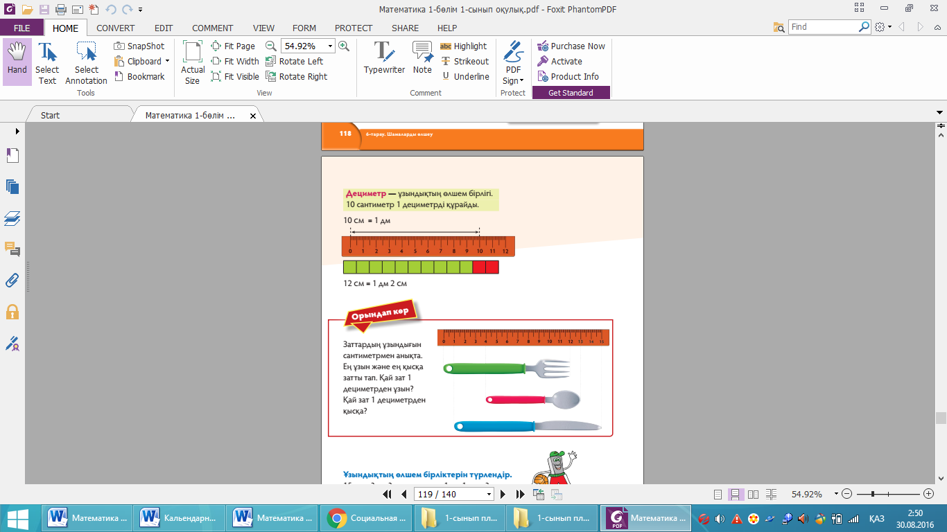 Тиісті парақшаларды сызықпен қос. Оқу-шыларға суретке сүйеніп, ұзындығы бірдей, массасы әртүрлі, биіктігі бірдей, көлемі әртүрлі және массасы бірдей, өлшемі әртүрлі заттар болатынын анықтатып, үйден осы мысалдардың негізінде мұндай заттарды тауып, салыстырған заттардың атын жазып келуді тапсырыңыз. Заттардың ұзындығын өлше. Нәтижесін кестеге жаз. Заттардың ұзындығын кестегe толтыру көзделеді. Үйден осындай заттар тап, атауларын жаз. Оқушылар заттардың мысалдарын тауып, олардың атауларын жазу керек. Заттар берілген шарттарға сәйкес келуі керек. Тапсырма берілген бір заттың әртүрлі шамалардың өлшеу дағдысын бекітеді. Заттардың ұзындығын өлше. Оқушылар заттардың ұзындығын тауып, кестеге толтырады. Жауабы: сағат — 11 см, мәшине — 10 см, қонжық — 12 см. Сыныпта немесе үйде өлшеп көр. Тапсырма заттардың ұзындығын өлшеу туралы білімдерін бекітуге беріліп отыр. |