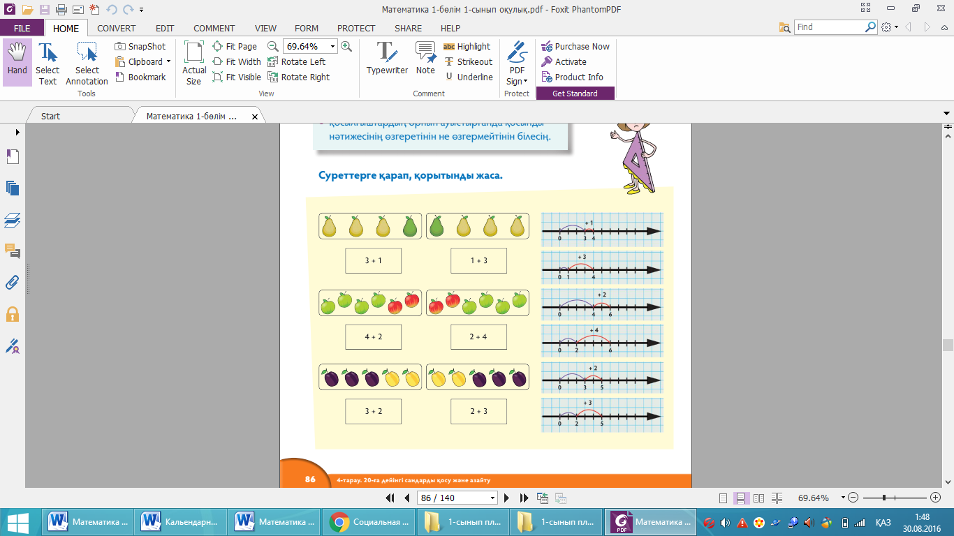 Бос шаршыларды толтыр. Тапсырмада екі амалды жақшасыз өрнектегі арифметикалық амалды орындап, торкөздерге аралық және жалпы нәтижені жазу талап етіледі. Тапсырмадағы сандар оқушылар дың сандар кестесі мен сандық сәулені қолданып қосуға жаттығуы үшін таңдалып алынған. Жауабы: а) 5+1+4=10 ә) 9-3+2=8 1+1+4=6 4-3+2=3 4+1+4=9 10-3+2=9 2+1+4=7 8-3+2=7 Дельфиндер. Бұл тапсырма алдыңғы тапсырма сияқты орындалады. Жауабы: 70; 20. Шаңғышыға көмектес. Оқушылар қосуға беріл ген тапсырмаларды тізбектеп орындауы керек. Есептеу нәтижесін жалаушаларға жазады. Соны мен қатар қосындыда 20 саны шығу үшін ең соңғы қосылғыштың қаншаға тең болу керегін табады. Егер берілген тапсырма сыныпта орындалса, жұмыстың жалғасы ретінде тез санауға арналған жұптық жарыс ұйымдастыруға болады. Жауабы:cоңғы қосылғыш — 5. |