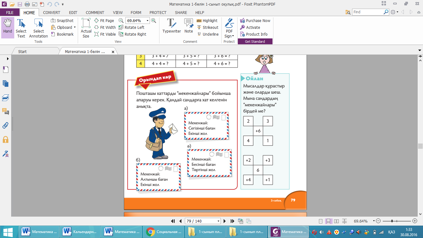 Бос шаршыларды толтыр. Тапсырмада екі амалды жақшасыз өрнектегі арифметикалық амалды орындап, торкөздерге аралық және жалпы нәтижені жазу талап етіледі. Тапсырмадағы сандар оқушылар дың сандар кестесі мен сандық сәулені қолданып қосуға жаттығуы үшін таңдалып алынған. Жауабы: а) 5+1+4=10 ә) 9-3+2=8 1+1+4=6 4-3+2=3 4+1+4=9 10-3+2=9 2+1+4=7 8-3+2=7 Дельфиндер. Бұл тапсырма алдыңғы тапсырма сияқты орындалады. Жауабы: 70; 20. Шаңғышыға көмектес. Оқушылар қосуға беріл ген тапсырмаларды тізбектеп орындауы керек. Есептеу нәтижесін жалаушаларға жазады. Соны мен қатар қосындыда 20 саны шығу үшін ең соңғы қосылғыштың қаншаға тең болу керегін табады. Егер берілген тапсырма сыныпта орындалса, жұмыстың жалғасы ретінде тез санауға арналған жұптық жарыс ұйымдастыруға болады. Жауабы:cоңғы қосылғыш — 5. |