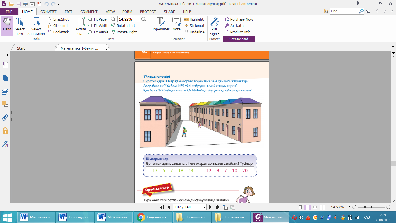 Әртүрлі арифметикалық амалмен берілген өрнек тің мәнін есептеу үшін амалдың ретін сақтау қажет, яғни солдан оңға қарай бірізділікпен орындау керек. Бірінші амалда бірінші мен екінші санның айырмасы мен қосындысын табамыз. Екінші амалда үшінші сан мен бірінші амал нәтижесін қосып орындаймыз. Кіріспе тапсырма. Сабақтың басында оқушы ларға тапсырманы 4 адамнан тұратын топта орын дауды ұсыныңыз. Әр топ алғашқы ондық сандар жазылған 3 парақша және 1 бос парақша алады. 1. Оқушылар орындарында кез келген рет пен бір қатарға тұрады және “Сандарды қос” дегенде қолындағы ақпаратты бір-біріне беретінін түсіндіріңіз. Бірінші оқушы солдан оңға қарай екіншіге, екінші — үшіншіге, үшінші — төртіншіге береді. Оқушылардың тізбегін аяқтайтын төртінші оқушы үш санның қосындысын тауып, жауабын өз парақшасына жазу керек. Оқушылардың өзінің әрекетін мынадай сөйлемдермен түсіндіріп отыруын қадағалаңыз: “Біз алғашқы екі санды қостық…”, “біз оның нәтижесін алдық…”, “содан соң біз келесі санды қостық…”, “нәтижесін алдық…”, “Бұл мысалдың нәтижесі…+…+…” Бірнеше амалдан тұратын мысалды шешкен кезде амалдарды бірінен соң бірін Автобус жолаушылары. Осы тапсырманы жалпы сыныппен өткізіңіз. Оқушыларға мына сұрақтарды қойып әңгімеге тартыңыз: — Қоғамдық көлікке мініп көрдің бе? — Автобус қайда тоқтады? — Аялдамада не болады? — Автобустағы жолаушылардың саны аялдамаға келгенде өзгере ме? Неге? Тапсырма мәтінін оқыңыз және оқушылардан сұрақтарға жауап беруді сұраңыз. Оқушылардың ұсыныстарын тыңдап алыңыз және аялдамадағы жолаушылардың ауысымынан кейін автобустағы жолаушылардың санын көрсететін өрнекті құруды ұсыныңыз. Оқушылар жауаптарын тез айтуы мүмкін. Тапсырманың орындалуының дұрыстығын тексеруді ұсыныңыз және мына сұрақтарды қойыңыз: — Осы өрнек неше амалдан тұрады? — Қандай амалды бірінші орындадыңдар? — Қайсысын екінші орындадыңдар? Қосуға берілген екі амалды өрнектегі амал реті бірізділікпен солдан оңға қарай орындалуы тиіс деген қорытынды жасатыңыз. Алынған нәтижені салыстырыңыз. Жауабы: 16 жолаушы. |