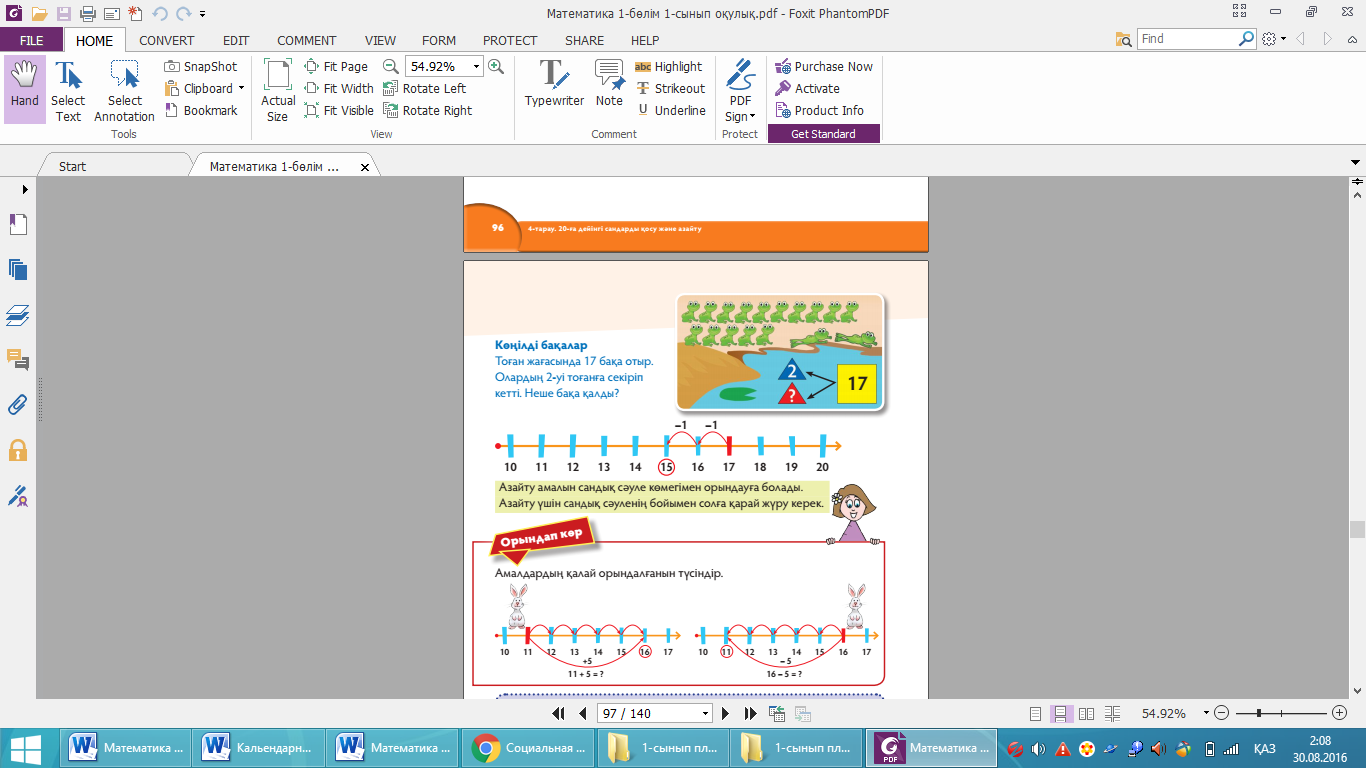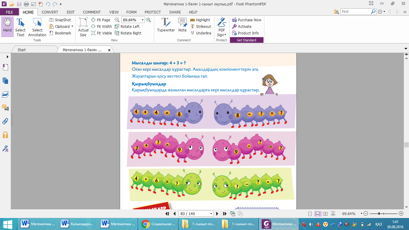 Бос шаршыларды толтыр. Тапсырмада екі амалды жақшасыз өрнектегі арифметикалық амалды орындап, торкөздерге аралық және жалпы нәтижені жазу талап етіледі. Тапсырмадағы сандар оқушылар дың сандар кестесі мен сандық сәулені қолданып қосуға жаттығуы үшін таңдалып алынған. Жауабы: а) 5+1+4=10 ә) 9-3+2=8 1+1+4=6 4-3+2=3 4+1+4=9 10-3+2=9 2+1+4=7 8-3+2=7 Дельфиндер. Бұл тапсырма алдыңғы тапсырма сияқты орындалады. Жауабы: 70; 20. Шаңғышыға көмектес. Оқушылар қосуға беріл ген тапсырмаларды тізбектеп орындауы керек. Есептеу нәтижесін жалаушаларға жазады. Соны мен қатар қосындыда 20 саны шығу үшін ең соңғы қосылғыштың қаншаға тең болу керегін табады. Егер берілген тапсырма сыныпта орындалса, жұмыстың жалғасы ретінде тез санауға арналған жұптық жарыс ұйымдастыруға болады. Жауабы:cоңғы қосылғыш — 5. |