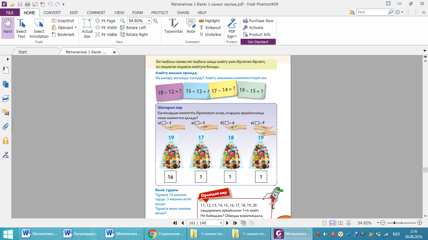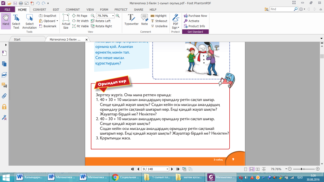 Сиқырлы қар қиыршығы. Оқушыларға ойын ды жұптасып ойнауды ұсыныңыз. Олар нүктелі текшені кезекпен лақтырады. Текшенің жоғарғы жағына түскен нүктелер санын қар қиыршығына жазып, шыққан мысалды жазуды ұсыныңыз. Текшені лақтыра отырып оқушылар мысалдар жазып, мынадай қорытындыға келеді: алған мысалдарының алтыдан артық болмайтынын, себебі текшенің барлығында алты жағы барын және қар қиыршықтарының орнында 1 , 2, 3, 4, 5 немесе 6 тұруы тиістігін айтады. Жауабы: 20 – 1 – 3 = 16 20 – 2 – 3 = 15 20 – 3 – 3 = 14 20 – 4 – 3 = 13 20 – 5 – 3 = 12 20 – 6 – 3 = 11 Шығарып көр. Оқушылар мысалдарды шешіп, жауаптарын өсу ретімен қойып, сәйкес келетін әріптерден сөздер құрастыру керек. Оларға берілген тапсырманы жұппен орындауды ұсыныңыз. Олар рөлдерін өз бетінше бөледі. Біреуі барлық мысалдарды шешеді, екіншісі тексереді немесе біреуі мысалдардың бір бөлігін, ал екіншісі қалған бөлігін шығарады. Оқушыларға барлық мысалдардың жауаптарын ламинатталған беттерге жазу және барлық жауапты сәйкес реттілікпен орналастырып, нәтижесінде алынған сөзді көрсету қажеттігін түсіндіріңіз. Оларға өз жауаптары жазылған беттерді тақтаға жабыстырып, өзара тексеру жұмысын жүргізуді сұраңыз. Жауабы: 9, 11, 13, 16, 19, 20. Қаңтар Орындап көр. Оқушыларға зерттеу жүргізуді ұсыныңыз. Зерттеу нәтижесінде олар екі амалмен берілген санды өрнектегі қосудың мәні амалдарды орындау ретіне байланысты еместігін түсінеді. Ал егер екі амалдың ең болмағанда біреуі азайту ама лы болса, онда амалдардың орындалу реті маңызды болып саналады. Бұл айдарда берілген тапсырма ны орындау үшін топпен жұмыс ұйымдастырыңыз. Себебі мұндай қорытындыға келу үшін талдау жасап, өз болжамын айтуы және оның ақиқат екенін тексеруі қажет. Топ пікірін ортаға салу үшін әр топтың бір мүшесі шығып, топтың пікірін айтуды ұсыныңыз.