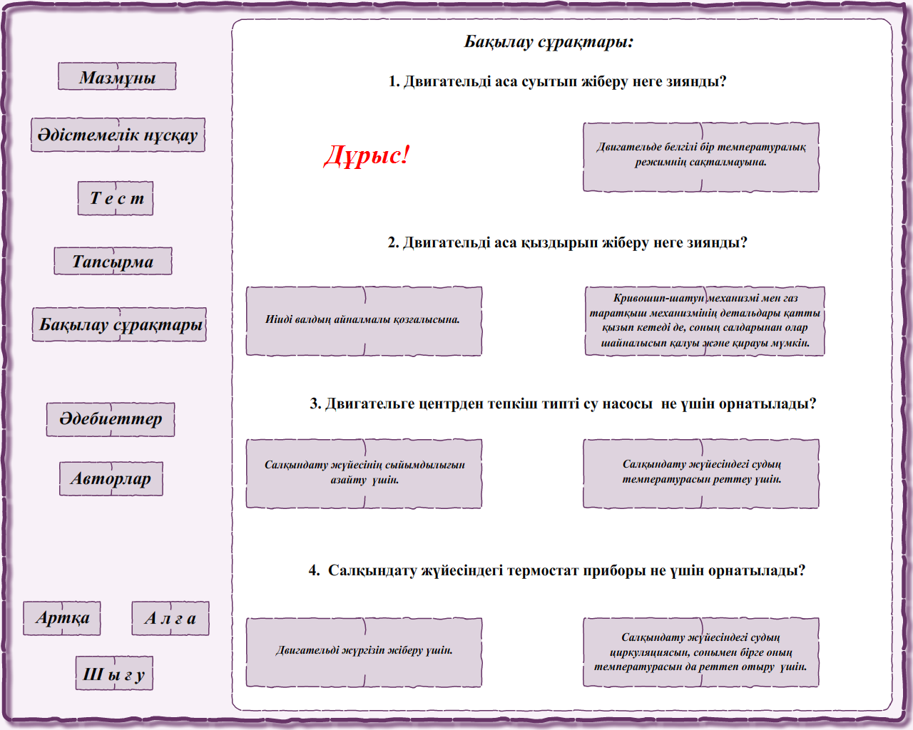 Электронды оқулық бойынша бақылау сұрақтары қойылады. Егер дұрыс жауап берсе «Дұрыс», дұрыс емес болса «Дұрыс емес» деп шығады.