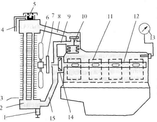 1-төгу краны; 2-радиатор; 3-қосалқы қабырғалар; 4-бу түтігі; 5-радиатор қақпағы; 6-желдеткіш; 7-шкив; 8,9,15-жеңшелер; 10-термостат; 11,12-су көйлегі, 13-термометр; 14-су насосы.