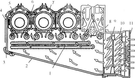 1-жағар май радиаторы; 2,3,4-ауа бағыттағыш қораптар; 5-цилиндрлер; 6-цилиндрлердің қосалқы қабырғалары; 7-ауа сыртқа шығатын канал-дар; 8-термореттегіш; 9-желдеткіш; 10-бағыттағыш қалақшалар; 11-сору каналы.