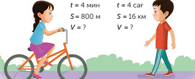 S=800м t=4 мин v=?м/мин Ш: v=S:t=800:4=200м/мин Ж: Әлияның жылдамдығы 200м/мин ә) t=4сағ S=16км V=?км/сағ Ш: v=S:t=16:4=4км/сағ Ж: Арманның жылдамдығы 4км/сағ |