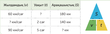4.2.1.8- бірқалыпты түзу сызықты қозғалыстағы арақашықтық формулаларынкөрсету және қолдану(s=v∙t, t=s: v, v=s:t)4.5.1.2- есептерді шығару үдерісінде жылдамдық, арақашықтық шамаларының өзара тәуелділігін пайдалану |