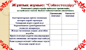Ұйымдастыру: -оқушылардың сабаққа қатысымын тексеру; - сабақ мақсатымен таныстыру. Қызығушылықты ояту. Сабақты бастамас бұрын ынтымақтастық атмосферасын қалыптастырып алайық. «Барабан» әдісі бойынша берілген сөздер арқылы, сабаққа деген жақсы ниет тілектерімізді білдіреміз. Қима қағаздар арқылы оқушыларды 3 топқа бөлеміз. 1-топ Өсімдіктер қозғалысы тобы 2- топ Тропизм тобы 3- Таксис тобы |