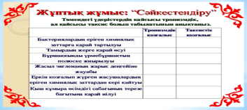 Оқушылар өсімдіктер,жануарлар суреті таратылады. Берілген суреттің астында қай топқа бірігетінін анықтау арқылы өз тобын тауып отырады.