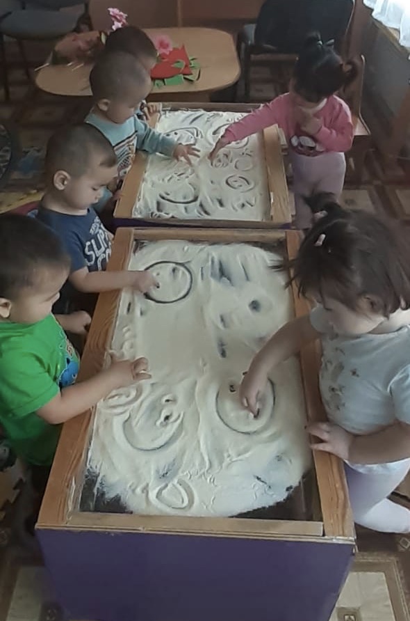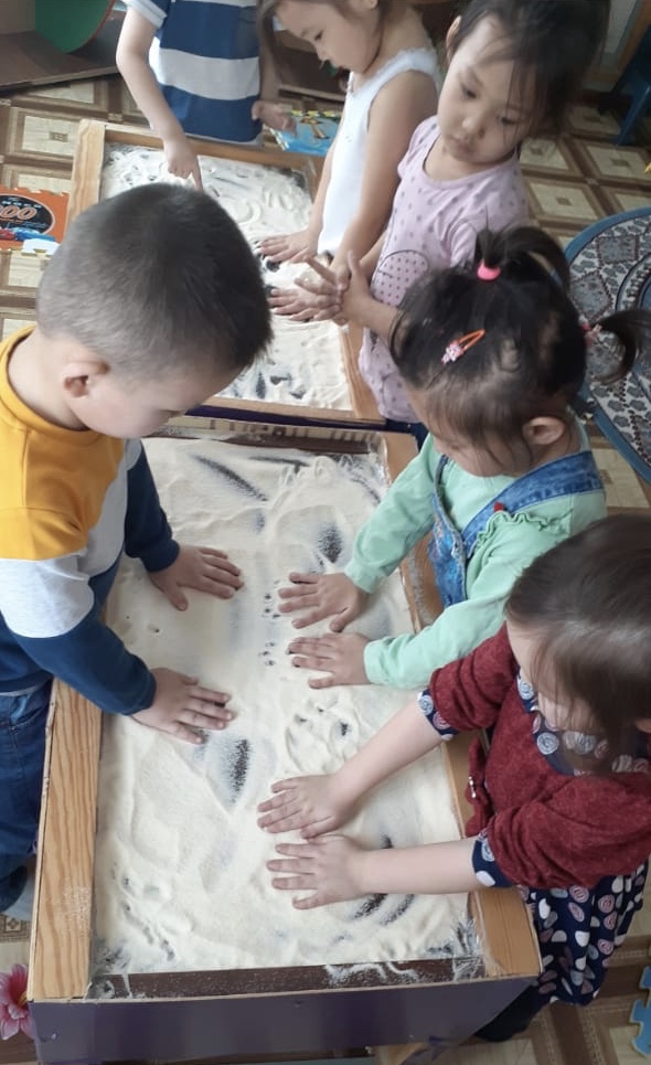 Су өткізбейтін ағаш қорап, құмжәшік Ойын барысы: Тәрбиеші әр түрлі «құммен сәлемдесуді» өтінеді, яғни әр түрлі әдістермен құмға қол тигізу.