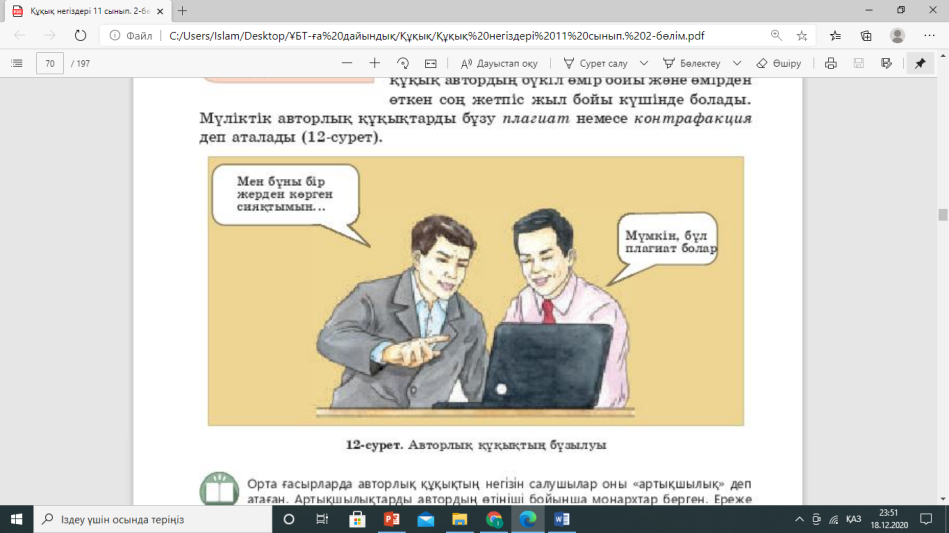 Авторлық құқықтың объектілеріне нелер жатпайды? Зияткерлік меншікті қорғауды қандай мемлекеттік орган қамтамасыз етеді? ЕБҚ оқушы (көру және есту қабілеті төмен) сұрақтарға жауапты жазбаша ұсынады. «Сұрақ-жауап» 1.Авторлық құқық дегеніміз не? Сабақтас құқық дегеніміз не? 2. Сабақтас құқықтың авторлық құқықтан айырмашылығы неде? 3. Авторлық құқықтың объектілеріне нелер жатпайды? Зияткерлік меншікті қорғауды қандай мемлекеттік орган қамтамасыз етеді? Жағдаяттармен жұмыс Оқушыларға жағдаяттық тапсырмаларды оқып, өз тұжырымдарын білдіруге тапсырма беріледі. 1-деңгейлі тапсырма. Жағдаяттық тапсырмаларды оқып, өз тұ ырымдарыңды білдіріңдер. 1.А. қалалық Полиция департаментінің қызметкері полиция лейтенанты К. Қазақстан Республикасы Әділет министрлігінің Зияткерлік меншік құқығы комитеті патрульдік полицияларына бейне жазатын құрылғысы бар каска киіп жүруді ұсынып, хат жазды. Азамат К. осы идеясы үшін авторлық құқыққа ие бола ала ма? 2.Қ. қаласының бір тұрғыны «Қара батыр» атты кітап жазды. Осы азамат авторлық құқық алуға құқылы ма? 3.Нұр-сұлтан қаласында еткен концерттердің бірінде Моцарттың туындылары орындалды. Концерт ұйымдастырушылары композитор туыстарының келісімінсіз Моцарттың музыкаларын қоюға құқығы бар ма? 4. А. қалалық Полиция департаментінің қызметкері полиция лейтенанты К. Қазақстан Республикасы Әділет министрлігінің Зияткерлік меншік құқығы комитеті патрульдік полицияларына бейне жазатын құрылғысы бар каска киіп жүруді ұсынып, хат жазды. Азамат К. осы идеясы үшін авторлық құқыққа ие бола ала ма? 5. Қ. қаласының бір тұрғыны «Қара батыр» атты кітап жазды. Осы азаматавторлық құқық алуға құқылы ма? 6. Нұр Сұлтан қаласында өткен концерттердің бірінде Моцарттың туындылары орындалды Концерт ұйымдастырушылары композитор туыстарының келісімінсіз Моцартың музыкаларын қоюға құқығы бар ма 2 деңгейлі тапсырма. Жеке жұмыс. Зияткерлік меншік тақырыбыа баяндама даындандар ЕБҚ оқушыға суреттер/иллюстрациялар ұсынылады; |