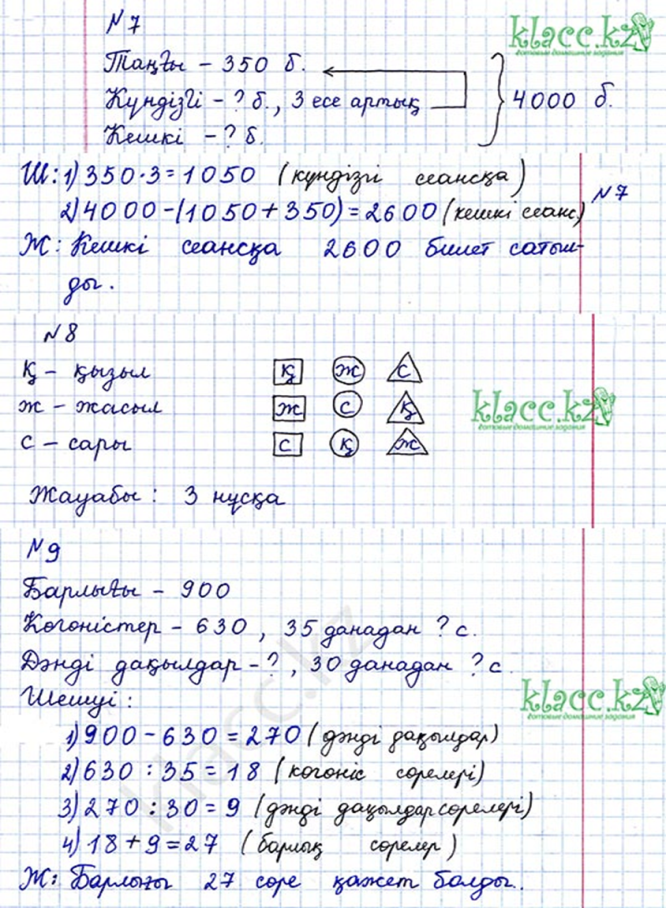 (1163-807)*259=92204 92204=92204 № Т К Кешкі-? Б Ш: 350*3=1050 4000-(1050+350)=2600 ЖЖ: Кешкі сеансқа 2600 билет сатылды. №8 есеп Қ-қызыл Ж-жасыл С-сары Ж: 3 нұсқа