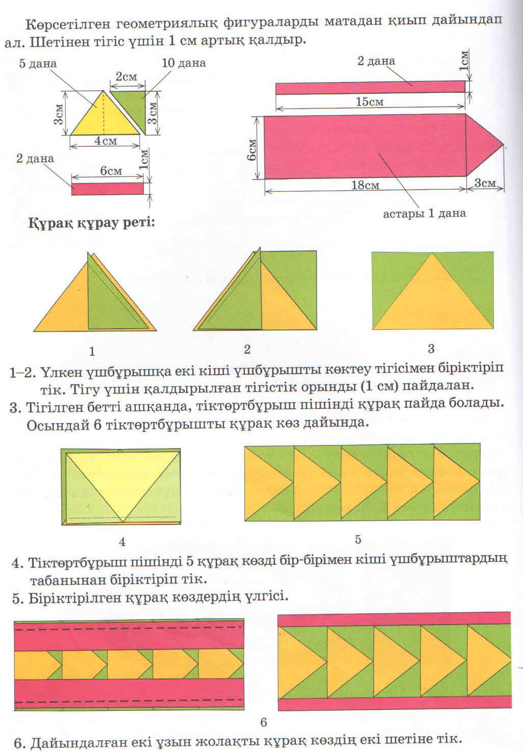Қажетті құралдар: сызғыш, қарындаштар, мата қиындылары, дәптер, қайшы, ине, жіп.