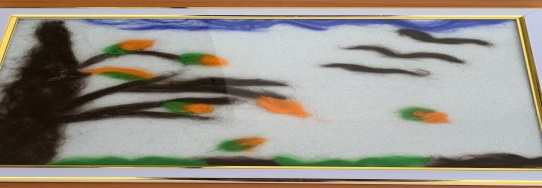 . Сөздік жұмыс:Губка, фетр, Фильцевание сөзі қазақ тіліне "жүнді жиыру", "жүнді шымырлату" немесе "жүнді валяние әдісімен өңдеу" деп аударылады. Пысықтау. Сұрақ жауап алу . 1. Құрғақ жүн дегеніміз не? 2. Құрғақ жүнмен жұмыс істеу техникасы қалай аталады? 3. Қандай құрал-жабдықтар қажет? 4. Жүнмен жұмыс кезінде қандай қауіпсіздік ережелерін сақтау керек? Сарамандық жұмыс 1) Жұмыс орнын дайындау 2)Қауіпсіздік ережесін қайталау. 3) Өзіндік жұмыс : оқушылар өздерінің «Күзгі көрініс» тақырыбындағы композициясын құрғақ жүннен жасап бастайды - Мұғалім жеке көмек көрсетеді Сергіту сәті .(Қал қалай) . Қал қалай ? Жүріс қалай ? Бергенде қалай ? Алғанда қалай ? Түнгі ұйқы қалай ? Ойнағанда қалай ? Ұрысқанда ше? Қазір көңіл күйіміз қалай? Сарамандық жұмыс жалғасы 4) Оқушылар өздерінің «Күзгі көрініс» тақырыбындағы композициясын жалғастырады . 5) Жасалған жұмыс сапасын тексеру, ауызша есеп беру . 6). Жұмыс орнын жинастыру |