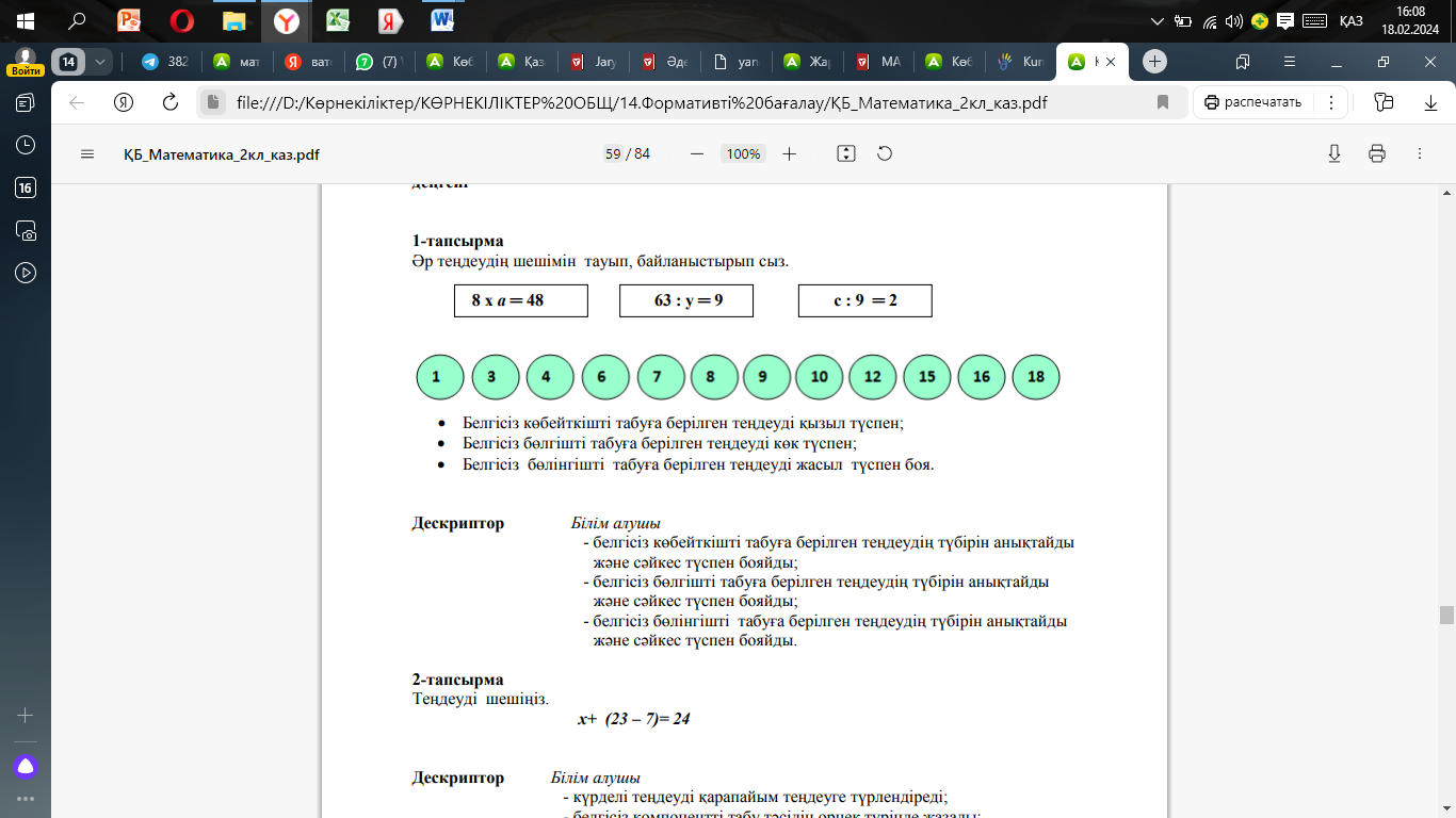 Теңдеулерді оқиды және салыстырады Әр теңдеудің шешімін тауып, байланыстырып сызады |